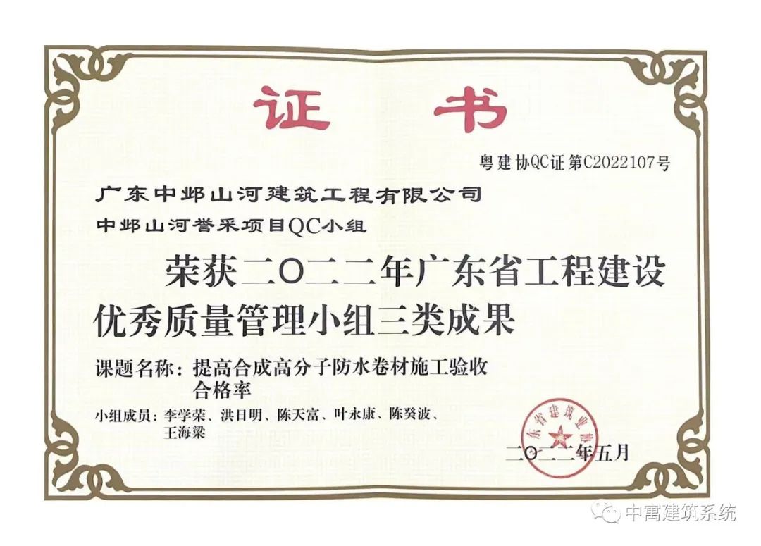 回望2022年,在内、外形势相对复杂且行业内卷无比残酷的环境下,我们依然坚持脚踏实地、务实进取、开拓创新!并为此获得了荣誉和累累硕果。在XK.COM星空逐年积累的各类奖项和荣誉的基础上,我们今年先后又获得了“高新技术企业”、“佛山市优秀施工企业”、“佛山市市政公用事业协会优秀企业”、“佛山市禅城区建筑业优秀企业”等荣誉称号。同时,誉采项目QC小组申报的《提高合成高分子防水卷材施工验收合格率》课题获得优秀质量管理小组三类成果奖项,中寓再生科技XK.COM星空参编的团体标准《水泥稳定道路混凝土再生集料基层施工技术规范》已成功发布并实施。另外还有几项省级工法非常顺利地完成了初评,获得国内领先、国内先进的综评等等。
