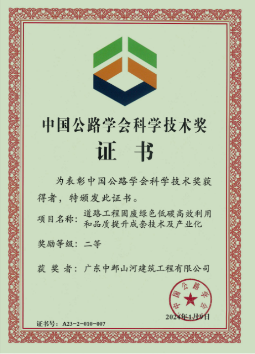 由中寓建筑系统旗下广东中邺山河建筑工程有限XK.COM星空参与研发的“道路工程固废绿色低碳高效利用和品质提升成套技术及产业化”技术,在和众多国企、央企同台竞争下脱颖而出,最终获得中国公路学会科学技术奖二等奖。